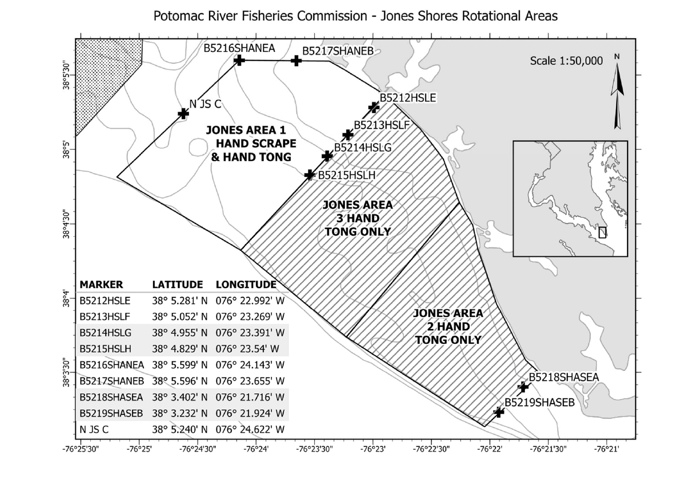 - That portion of the Potomac River to be known as “Area 1” and enclosed within the following described boundaries: Beginning at a point (37˚ 58.668’ N, 76˚ 17.229’ W) at the mouth of the Potomac River; thence northwesterly to a point (38˚ 4.640’ N, 76˚ 29.309’ W); thence northerly to a point (38˚ 6.149’ N, 76˚ 28.458’ W); thence easterly following the jurisdictional boundary of the Commission to the point (38˚ 5.817’ N, 76˚ 23.853’ W); thence southwesterly to a point (38˚ 4.816’ N, 76˚ 25.192’ W); thence southeasterly to the point (38˚ 4.323’ N, 76˚ 24.132’ W); thence southeasterly to a point (38˚ 3.738’ N, 76˚ 23.228’ W); thence southeasterly to a point (38˚ 3.134’ N, 76˚ 22.044’ W); thence northeasterly to a point (38˚ 3.489’ N, 76˚ 21.566’ W); easterly following the jurisdictional boundary of the Commission to the point (38˚ 2.188’ N, 76˚ 19.333’ W); thence southeasterly to the point of the beginning, less and except such portions of the described Area otherwise closed by Order or Regulation of PRFC.